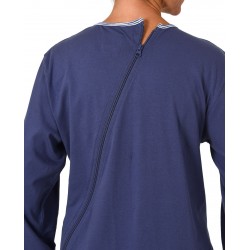Der Pflegeoverall ist in einem Stück gefertig, durch sein modernes Design sieht er optisch genau wie ein gamz normaler Schlafanzug aus.