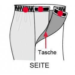 L’ensemble est complété avec un pantalon qui s’ouvre sur les deux côtés au moyen de bandes Velcro. La taille de ce pantalon est élastique pour plus de confort et possède une poche de chaque coté.