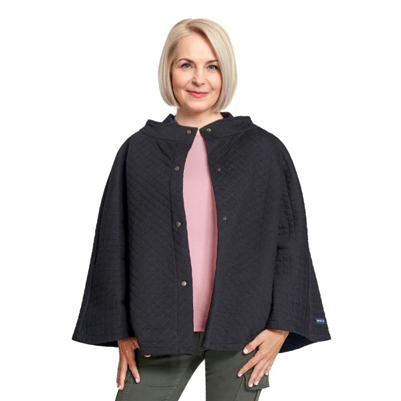Poncho cape très confortable avec une ouverture/fermeture à l'avant par bouton-pression. Ce poncho permet aussi d’être porté avec la fermeture dans le dos en cas d’enfilage par une tierce personne. Sa forme ample sans manches permet un enfilage sans douleur. Très pratique il peut être porté à l’intérieur pour un surplus de chaleur ainsi qu’à l’extérieur pendant la mi- saison.